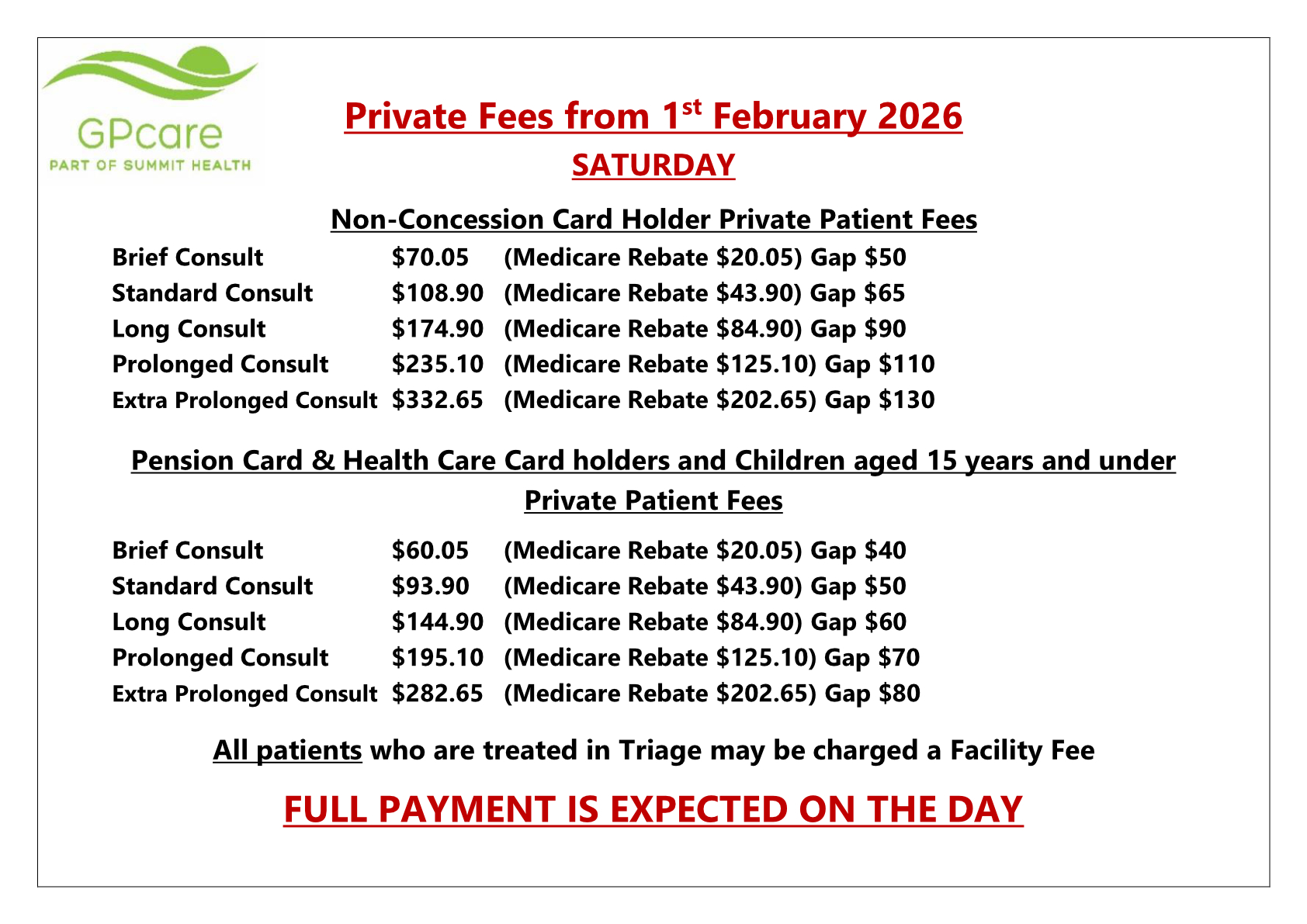 Please note that treatments and procedures involving a Nurse in Triage may incur an additional fee which requires an upfront payment for all patients on the day. After your treatment you will be given a Facility Fee (FF) card, please give this card to GPcare reception prior to leaving. There is no rebate through Medicare for this fee.